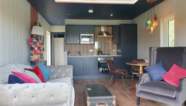 In Two lodge - sleeps four adults and is perfect for a group of friends or family break. With a private bar area, dining area and fire pit it’s a great place to gather under the stars. There are two double bedrooms, one at either end of the lodge and a shower room to share.